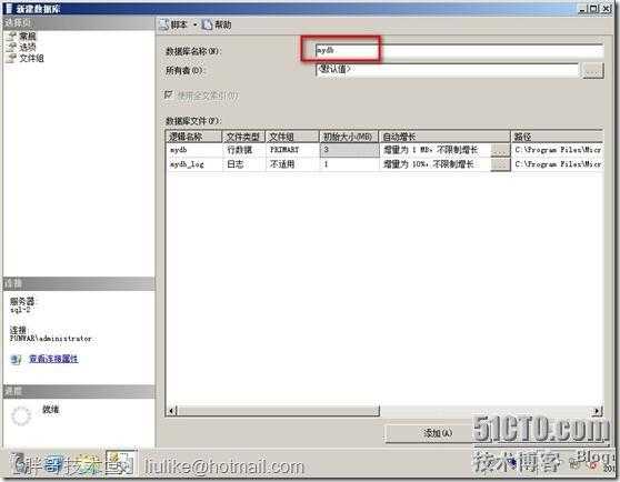 创建与主体服务器上需要镜像的数据库相同名称的数据库——mydb(如图15)。同时,数据库文件放置的位置应该相同,各属性也应该配置相同。