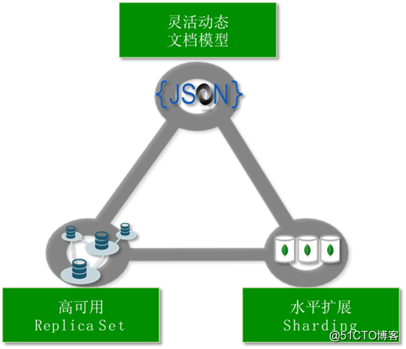功能丰富:JSON文档模式,动态的数据模式,二级索引强大,自动分片,水平扩展,自动复制,高可用,文本搜索,企业级安全聚合框架MapReduce,大文件存储GirdFS