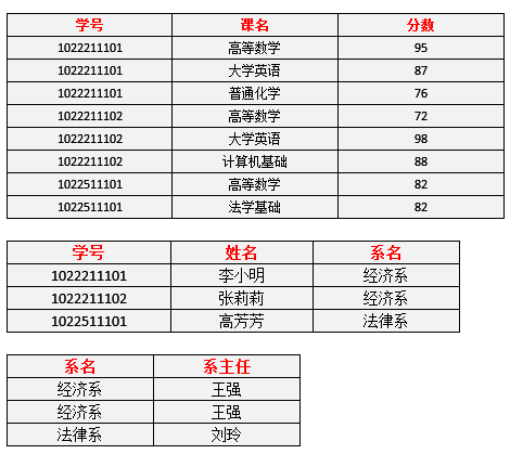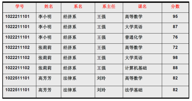 注1:根据三种关系完整性约束中实体完整性的要求,关系中的码(注2)所包含的任意一个属性都不能为空,所有属性的组合也不能重复。为了满足此要求,图中的表,只能将学号与课名的组合作为码,否则就无法唯一地区分每一条记录。
