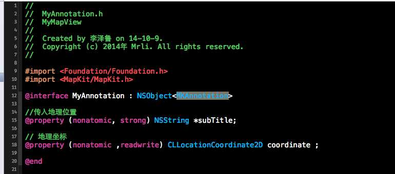 2.编写标注类,标注类必须实现MKAnnotation协议。MyAnnotation.h中的代码例如以下: