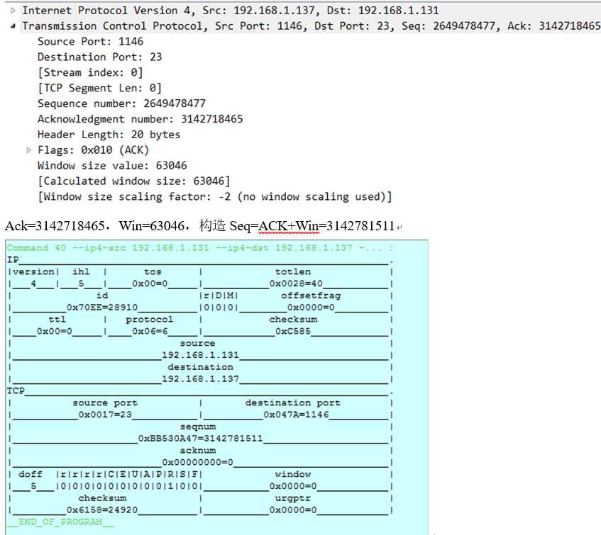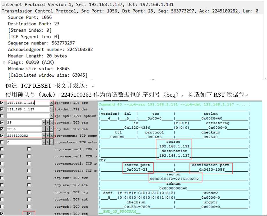 使用确认号(Ack): 3142715117+10=3142715127作为伪造数据包的序列号(Seq),构造如下RST数据包: