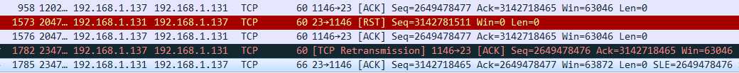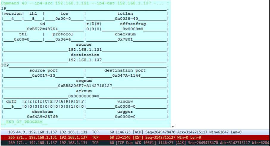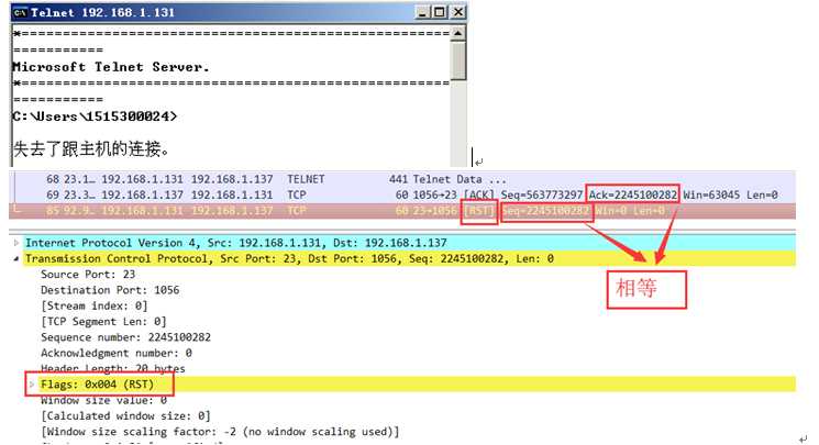 伪造的数据包发送完成后,Telnet客户端立即断开了连接,同时wireshark上也抓到了对应的伪造的RST数据包,结果截图如下:
