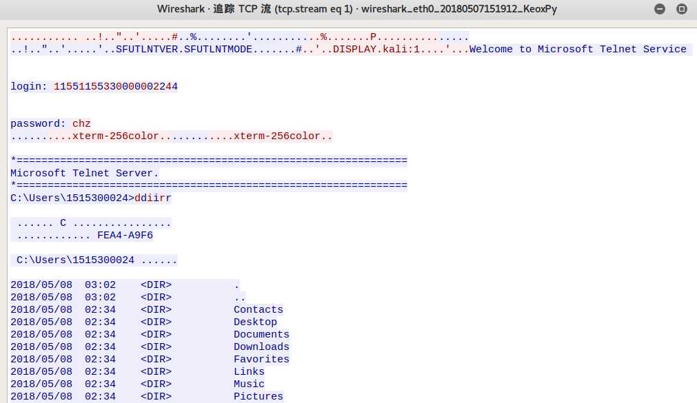 使用Wireshark的流追踪功能还原出本次明文传输的Telnet通信过程,可以看出这些信息和客户端上的过程基本一致