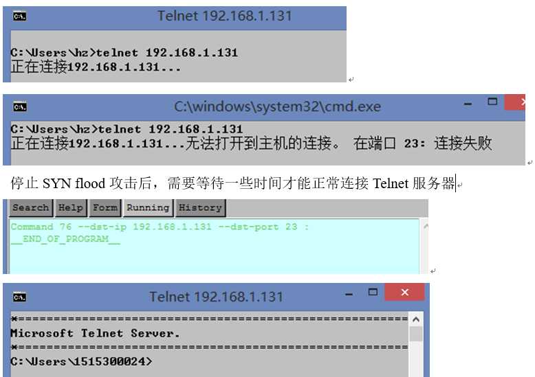 (4)退出登录,从第三台机器上利用 netwox/netwag 工具对Telnet服务器进行 SYN flood 攻击。捕获 DDOS 攻击踪迹。尝试再次登录 Telnet 服务器,解释现象。