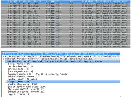 抓取的DDOS 攻击踪迹如下,可以发现这些攻击包高度相似,目的地址都是Telnet服务器的IP:192.168.1.131,类型都是SYN请求包,但是源地址没有任何规律