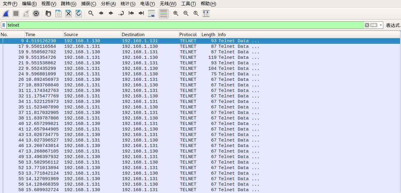 从客户端命令行上输入 telnet IP 地址,之后输入帐号/口令字,登入 Telnet 服务器。同时在客户端开启Wireshark抓包工具,抓取客户端 192.168.1.130 登录到Telnet 服务器192.168.1.131 的数据包