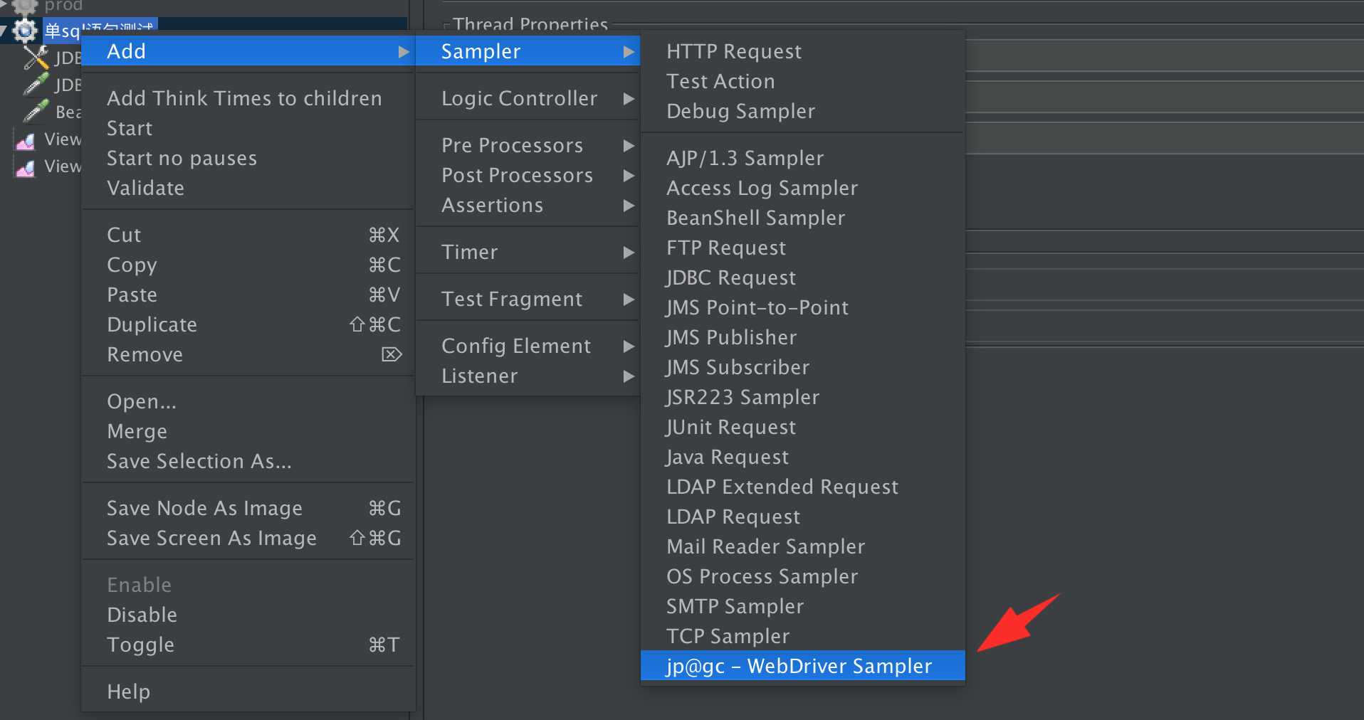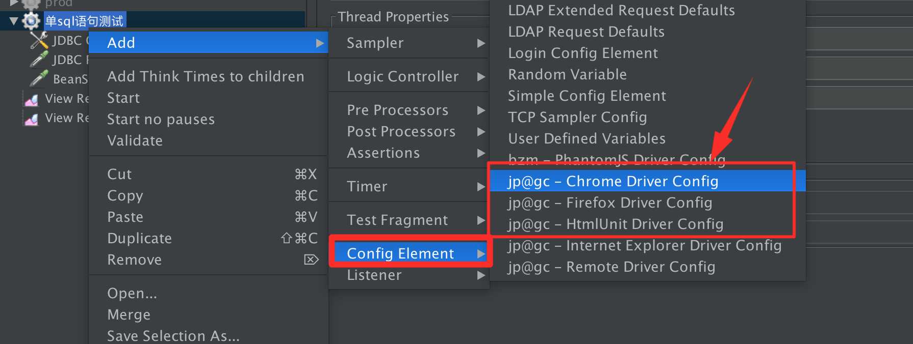 2、添加jar后的效果,展示了chrome/firefox/htmlUnit driver config和webdriver sampler,如下: