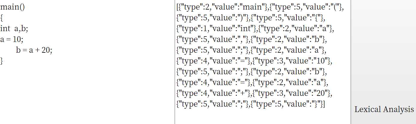 <!DOCTYPE html><html> <head> <meta charset="UTF-8"> <title>Lexical_Analysis</title> <link href="https://fonts.googleapis.com/css?family=Noto+Serif+SC" rel="stylesheet"> <style> main { /*对子元素开启弹性布局*/ display: flex; /*弹性元素在必要的时候换行*/ flex-wrap: wrap; /*将弹性元素居中*/ justify-content: center; } textarea, button { font-family: ‘Noto Serif SC‘, STFangSong, serif; font-size: 17px; } </style> </head> <body> <main> <textarea name="input" rows="20" cols="40"></textarea> <textarea name="output" rows="20" cols="40"></textarea> <button name="compile">Lexical Analysis</button> </main>s <script> let inputBox = document.querySelector("textarea[name=input]"); let outputBox = document.querySelector("textarea[name=output]"); let btnCompile = document.querySelector("button[name=compile]"); btnCompile.addEventListener("click", event => { let inputCode = inputBox.value; outputBox.value = JSON.stringify(Lexical_Analysis(inputCode)); }); /* * 规则: 识别保留字:if、int、for、while、do、return、break、continue; 单词种别码为1。 其他的都识别为标识符;单词种别码为2。 常数为无符号整形数;单词种别码为3。 运算符包括:+、-、*、/、=、>、<、>=、<=、!= ;单词种别码为4。 分隔符包括:,、;、{、}、(、); 单词种别码为5。 */ const reservedWords = [‘if‘, ‘int‘, ‘for‘, ‘while‘, ‘do‘, ‘return‘, ‘break‘, ‘continue‘]; const operators = [‘+‘, ‘-‘, ‘*‘, ‘/‘, ‘=‘, ‘<‘, ‘>‘, ‘!‘, ‘>=‘, ‘<=‘, ‘!=‘]; const separators = [‘,‘, ‘;‘, ‘{‘, ‘}‘, ‘(‘, ‘)‘]; function Lexical_Analysis(str) { /** * current用于标识当前字符位置, * str[cur]即为当前字符 */ let cur = 0; /** * tokens存储词法分析的最终结果 */ let tokens = []; while(cur < str.length) { if(/\s/.test(str[cur])) { // 跳过空格 cur++; } else if(/[a-z]/i.test(str[cur])) { // 读单词 debugger; let word = "" + str[cur++]; // 测试下一位字符,如果不是字母直接进入下一次循环(此时cur已经右移) // 如果是则继续读字母,并将cur向右移动 while(cur < str.length && /[a-z]/i.test(str[cur])) { // cur < str.length防止越界 word += str[cur++]; } if(reservedWords.includes(word)) { tokens.push({ type: 1, value: word, }); // 存储保留字(关键字) } else { tokens.push({ type: 2, value: word, }); // 存储普通单词 } } else if(separators.includes(str[cur])) { tokens.push({ type: 5, value: str[cur++], }); // 存储分隔符并将cur向右移动 } else if(operators.includes(str[cur])) { let operator = "" + str[cur++]; if([‘>‘, ‘<‘, ‘!‘].includes(operator)) { // 如果下一个字符是=就添加到operator并再次向右移动cur if(str[cur] = ‘=‘) { operator += str[cur++]; } } tokens.push({ type: 4, value: operator, }); // 存储运算符 } else if(/[0-9]/.test(str[cur])) { let val = "" + str[cur++]; // cur < str.length防止越界 while(cur < str.length && /[0-9]/.test(str[cur])) { val += str[cur++]; } tokens.push({ type: 3, value: val, }); // 存储整数数字 } else { return "包含非法字符:" + str[cur]; } } return tokens; } </script> </body></html>