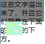 <!DOCTYPE html><html lang="en"><head> <meta charset="UTF-8"> <title>test</title> <style type="text/css"> *{ margin: 0; padding: 0; } p.one{ width: 100px; height: 50px; line-height: 20px; background: gray; } </style></head><body> <p class="one"> 这些文字溢出来了,并且它们层叠在下面的图片的下方。 </p> <<img src="images/background.jpg"></body></html>