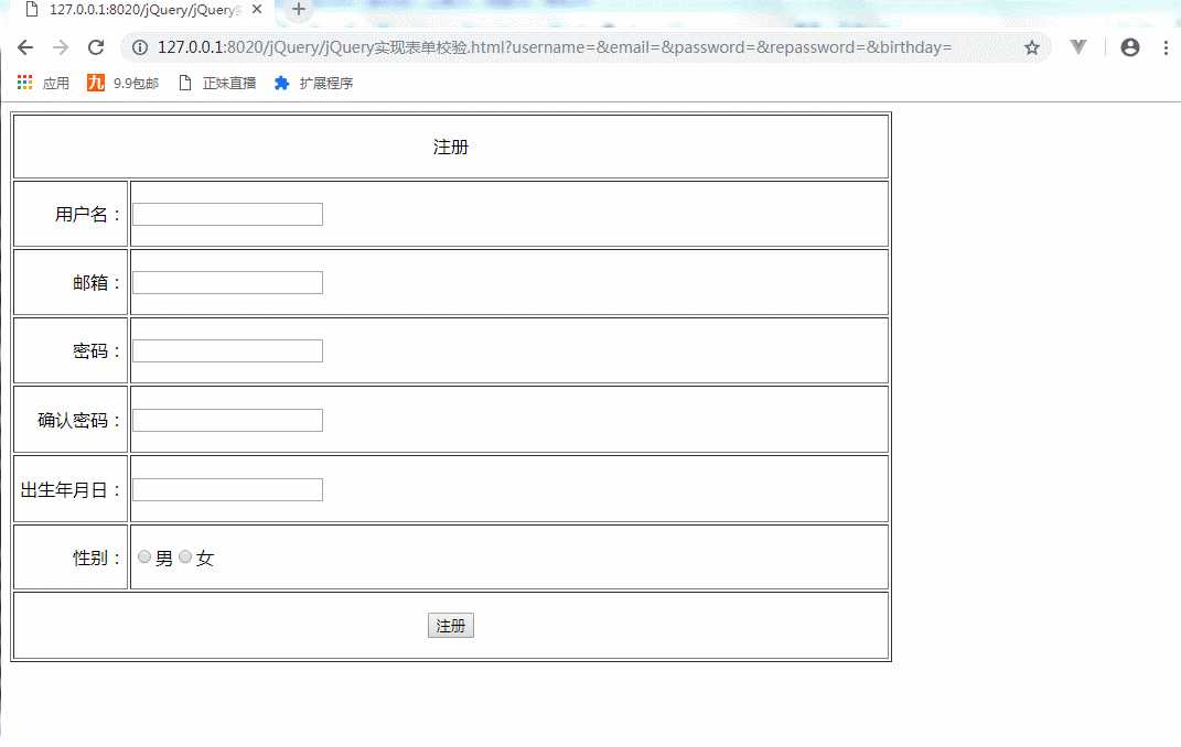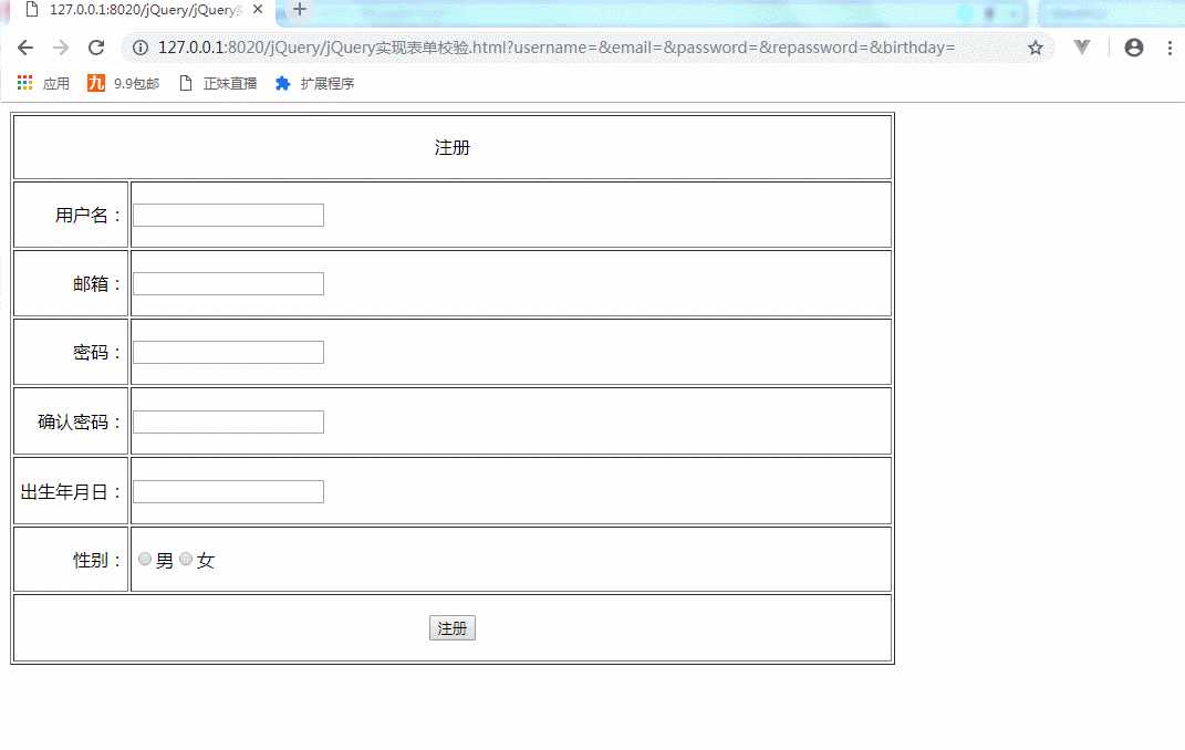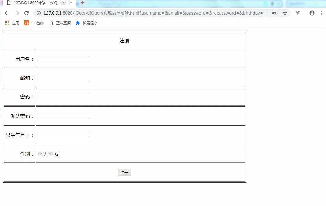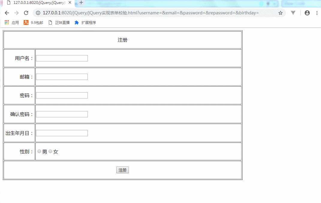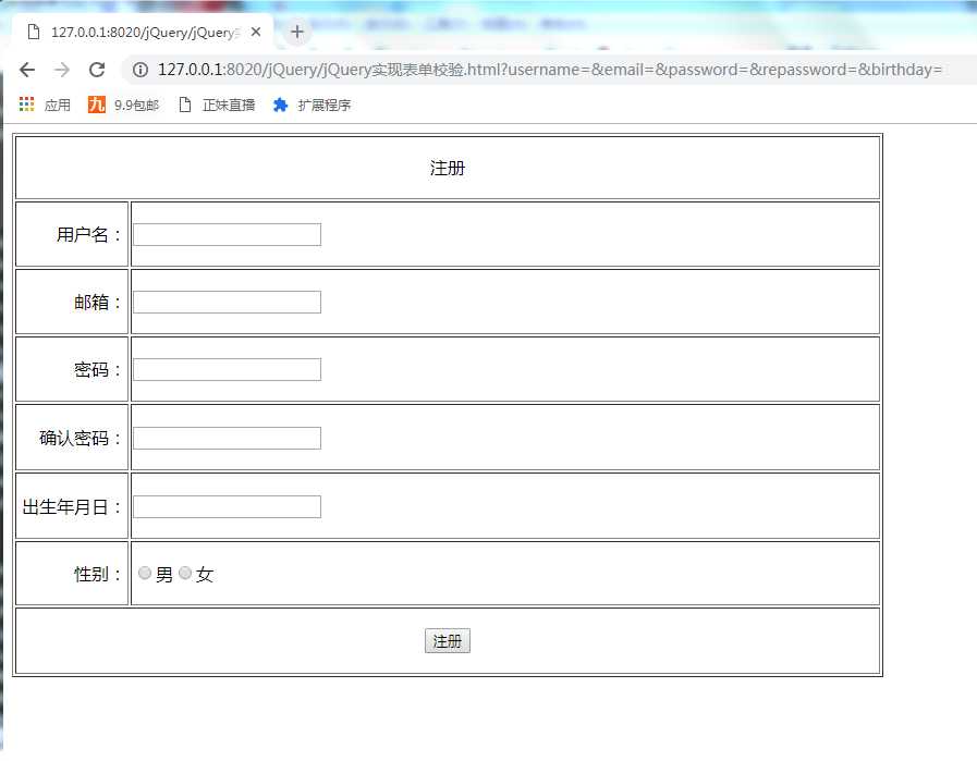 1 <!DOCTYPE html> 2 <html> 3 <head> 4 <meta charset="UTF-8"> 5 <title></title> 6 <script src="js/jquery-3.3.1.js"></script> 7 8 </head> 9 <body>10 <form id="registerForm">11 <table border="1" width="800px" height="500px" >12 <tr><td colspan="2" align="center" >注册 </td></tr>13 <tr><td align="right" width="100px">用户名:</td><td align="left"><input type="text" name="username"/></td></tr>14 <tr><td align="right">邮箱:</td><td align="left"><input type="text" name="email"/></td></tr>15 <tr><td align="right">密码:</td><td align="left"><input type="password" name="password"/></td></tr>16 <tr><td align="right">确认密码:</td><td align="left"><input type="password" name="repassword" /></td></tr>17 <tr><td align="right">出生年月日:</td><td align="left"><input type="text" name="birthday"/></td></tr>18 <tr><td align="right">性别:</td><td align="left"><input type="radio" name="sex"/>男<input type="radio" name="sex"/>女19 20 <label for="sex" class="error"></label>21 </td></tr>22 <tr><td colspan="2" align="center"><input type="submit" value="注册"/> </td></tr>23 24 </table>25 </form>26 </body>27 </html>