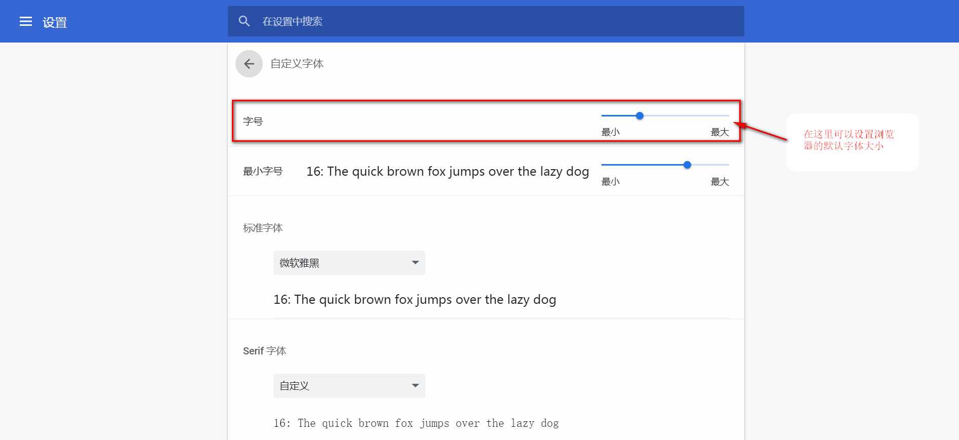 1. 浏览器的默认字体大小是16px,可以在浏览器中设置默认的字体大小(下面的Chrome浏览器的设置方法)