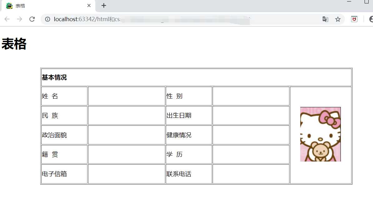 <!DOCTYPE html><html lang="en"><head> <meta charset="UTF-8"> <title>表格</title></head><body> <h1>表格</h1> <!-- table中的属性值不写单位,单位是像素 --> <!-- <table border="1" width="300" height="200" align="center"> <tr> <th>1</th> <th>2</th> <th>3</th> </tr> <tr> <td align="center">1</td> <td align="center">2</td> <td align="center">3</td> </tr> <tr> <td align="center">1</td> <td align="center">2</td> <td align="center">3</td> </tr> </table> --> <br /> <!-- 创建表格,快捷键:table>(tr>td*5)*6 按Tab键 --> <table border="1" width="800" height="300" align="center"> <tr> <th colspan="5" align="left">基本情况</th> </tr> <tr> <td width="15%">姓 名</td> <td width="25%"></td> <td width="15%">性 别</td> <td width="25%"></td> <td rowspan="5" width="20%" align="center"><img src="images/kity4.png" alt="照片" /></td> </tr> <tr> <td>民 族</td> <td></td> <td>出生日期</td> <td></td> </tr> <tr> <td>政治面貌</td> <td></td> <td>健康情况</td> <td></td> </tr> <tr> <td>籍 贯</td> <td></td> <td>学 历</td> <td></td> </tr> <tr> <td>电子信箱</td> <td></td> <td>联系电话</td> <td></td> </tr> </table></body></html>
