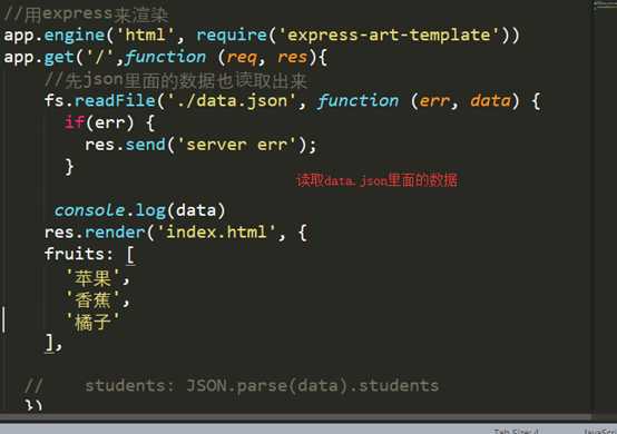 //配置express-art-templateapp.engine(‘html‘, require(‘express-art-template‘))//使用模板来渲染app.get(‘/‘,function (req, res){//这里会默认到views文件下面去找index.html res.render(‘index.html‘, { fruits: [ ‘苹果‘, ‘香蕉‘, ‘橘子‘ ] })})