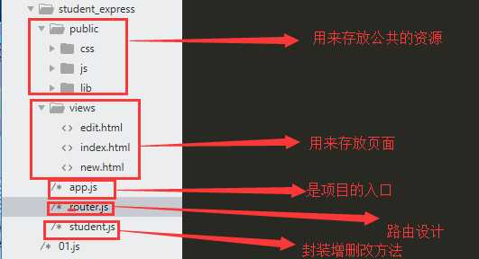 第七步:上面的router.js中既有get 路由的功能,又有fs查询读取文件的功能,我们也可以用模块化 的思维,将router里面的增删改功能给抽取出来放到一个新的student.js模块中,让这个新的模块实现我们需要的功能