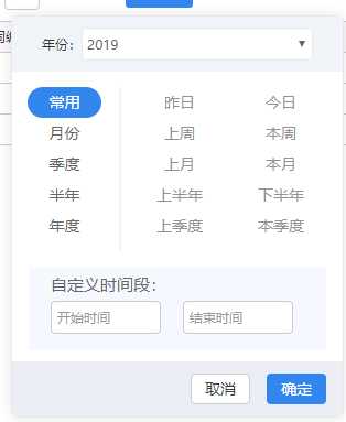 <div class="ht-layout-tool-item dataChoose"> <div>时间:</div> <div id="selectedInfo"></div> <div id="" class="SelectInfo_box"> <div class="selectYear_box"> <div>年份:</div> <select id="selectYear"> @*<option value="value">2019</option> <option value="value">2018</option> <option value="value">2017</option> <option value="value">2016</option>*@ </select> </div> <div class="selectItem"> <ul class="selectMenu"> <li class="selectActive">常用</li> <li>月份</li> <li>季度</li> <li>半年</li> <li>年度</li> </ul> <div class="lines"></div> <div class="selectInfo"> <div class="selectInfo_common"> <ul class=""> <li class="">昨日</li> <li class="">今日</li> <li class="">上周</li> <li class="">本周</li> <li class="">上月</li> <li class="">本月</li> <li class="">上半年</li> <li class="">下半年</li> <li class="">上季度</li> <li class="">本季度</li> </ul> </div> <div class="selectInfo_month"> <ul class="common_ul"> <li class="">1月</li> <li class="">2月</li> <li class="">3月</li> <li class="">4月</li> <li class="">5月</li> <li class="">6月</li> <li class="">7月</li> <li class="">8月</li> <li class="">9月</li> <li class="">10月</li> <li class="">11月</li> <li class="">12月</li> </ul> </div> <div class="selectInfo_quarter"> <ul class="common_ul"> <li class="">第1季度</li> <li class="">第2季度</li> <li class="">第3季度</li> <li class="">第4季度</li> </ul> </div> <div class="selectInfo_halfofyear"> <ul class="common_ul"> <li class="">上半年</li> <li class="">下半年</li> </ul> </div> <div class="selectInfo_thisyear"> <ul class="common_ul"> <li class="">本年度</li> </ul> </div> </div> </div> <div class="selectCustom"> <div class="customTop"> <div>自定义时间段:</div> <div class="openIcon"></div> </div> <div class="controlBox"> <input id="timeStart" type="text" class="WDate form-control StartDate" readonly="readonly" placeholder="开始时间" onclick="showDatePicker(this, {})" isvalid="yes" checkexpession="NotNull" /> <input id="timeEnd" type="text" class="WDate form-control EndDate" readonly="readonly" placeholder="结束时间" onclick="showDatePicker(this, {})" isvalid="yes" checkexpession="NotNull" /> </div> </div> <div class="selectOption"> <a id="btn_cancel" class="btn btn-default">取消</a> <a id="btn_makesure" class="btn btn-primary">确定</a> </div> </div> </div> <div class="ht-layout-tool-item"> <div class="dataChoose span-sm"> <div id="btnClear">重置时间</div> </div> </div>