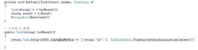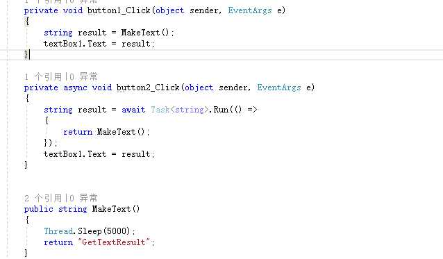 这是一个winform程序的代码片段,页面中有两个按钮,我们用maketext函数来模拟一个需要耗时的比如调用api获取数据的操作。