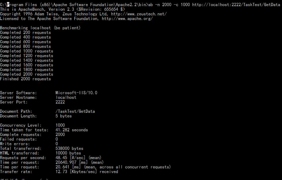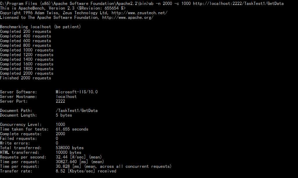public class TaskTestController : AsyncController { public void GetDataAsync() { AsyncManager.OutstandingOperations.Increment(); WebClient client = new WebClient(); client.DownloadDataCompleted += (sender, e) => { AsyncManager.Parameters["bytelength"] = e.Result.Length; AsyncManager.OutstandingOperations.Decrement(); }; client.DownloadDataAsync(new Uri("https://docs.microsoft.com/zh-cn/dotnet/framework/get-started/")); } public int GetDataCompleted(int bytelength) { return bytelength; } } public class TaskTest1Controller : Controller { public int GetData() { WebClient client = new WebClient(); var rsu = client.DownloadData(new Uri("https://docs.microsoft.com/zh-cn/dotnet/framework/get-started/")); return rsu.Length; ; } }然后我进行模拟1000个并发2000条请求,下面是测试结果