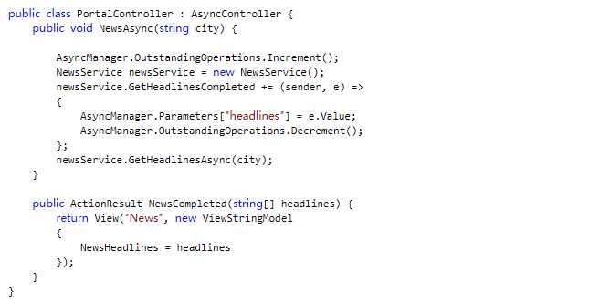 首先使用 AsyncManager.OutstandingOperations.Increment()函数来设定未完成的请求操作,默认是1,然后每一个异步操作完成,通过Decrement来使计数器减1,当计数器归零之后,则会调用xxxCompleted函数来返回结果。
