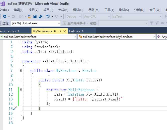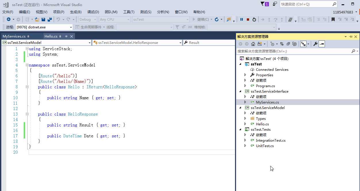 修改ssTest.ServiceModel中的Hello.cs,在HellopResponse中添加时间属性,然后修改MyServices中的代码