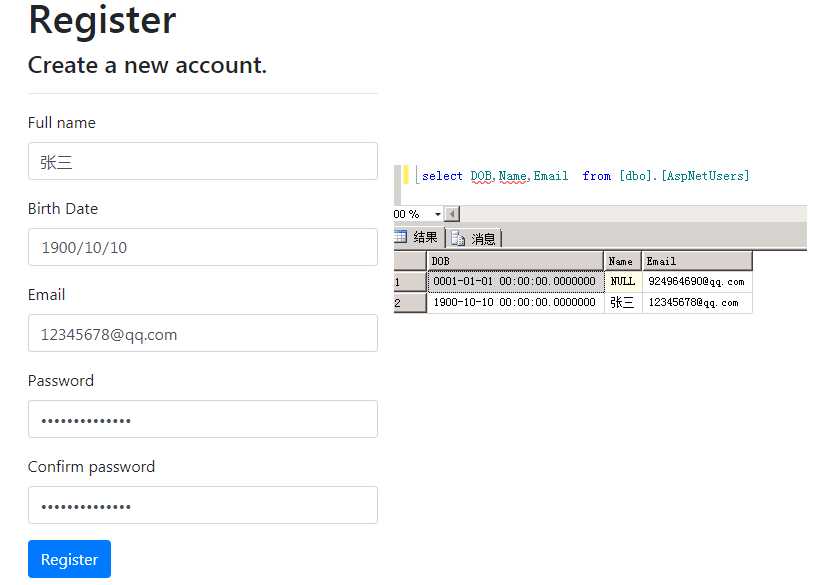 启动程序,运行注册页,保存成功后,查看数据库,如下所示: