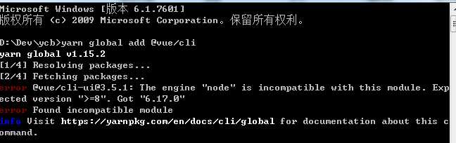 楼主在vue-cli官网,尝试使用vue-cli3脚手架+yarn包管理器构建项目时,命令行窗口提示node版本不对。如下图