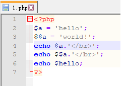 变量a被定义成了字符串hello 而变量$a被定于成了字符串world!