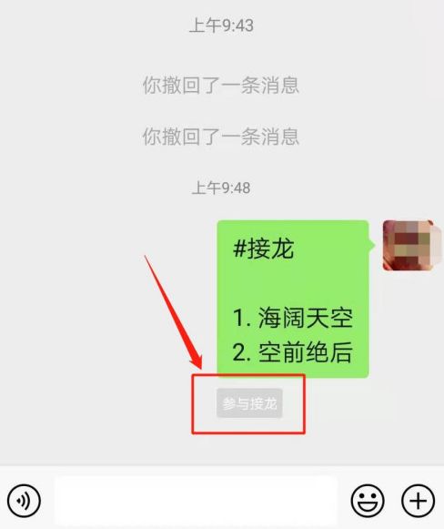 8、返回到群聊界面,可以看到接龙信息已发送完成躲帮。点击【参与接龙】,可继续发送接龙信息。
