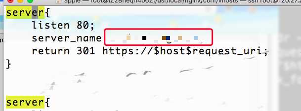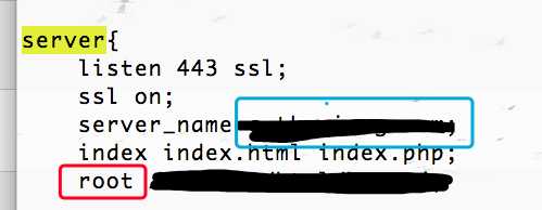 你进入要配置的域名的nginx的conf里面,红色框是根目录,蓝色框就是域名(之前这里是只有80的,我这个截图是修改之后的)