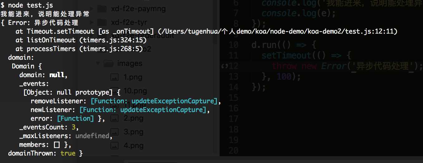 const domain = require(‘domain‘);const d = domain.create();d.on(‘error‘, (e) => { console.log(‘我能进来,说明能处理异常‘); console.log(e);});d.run(() => { setTimeout(() => { throw new Error(‘异步代码处理‘); }, 100);});