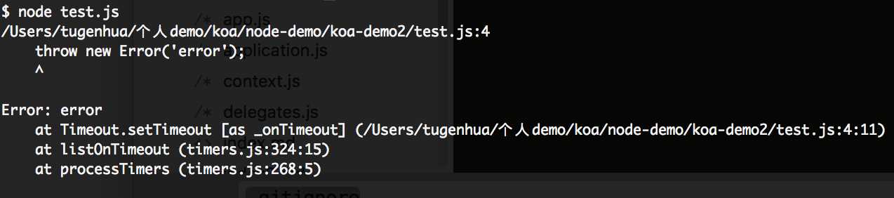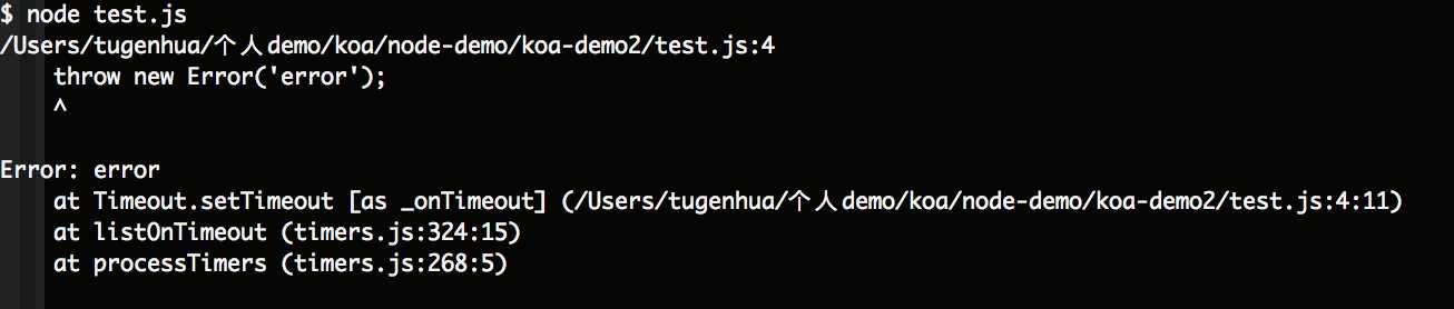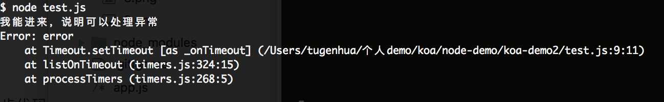 process.on(‘uncaughtException‘, (e) => { console.log(‘我能进来,说明可以处理异常‘); console.log(e);});function testFunc() { setTimeout(() => { throw new Error(‘error‘); }, 100);}testFunc();