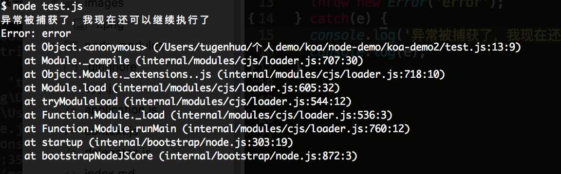 try { throw new Error(‘error‘);} catch(e) { console.log(‘异常被捕获了,我现在还可以继续执行了‘); console.log(e);}
