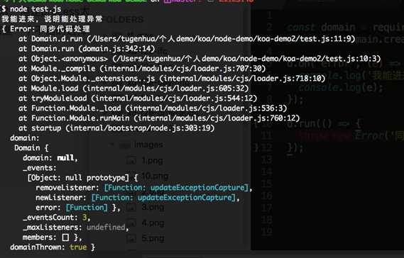 const domain = require(‘domain‘);const d = domain.create();d.on(‘error‘, (e) => { console.log(‘我能进来,说明能处理异常‘); console.log(e);});d.run(() => { throw new Error(‘同步代码处理‘);});