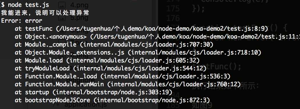process.on(‘uncaughtException‘, (e) => { console.log(‘我能进来,说明可以处理异常‘); console.log(e);});function testFunc() { throw new Error(‘error‘);}testFunc();