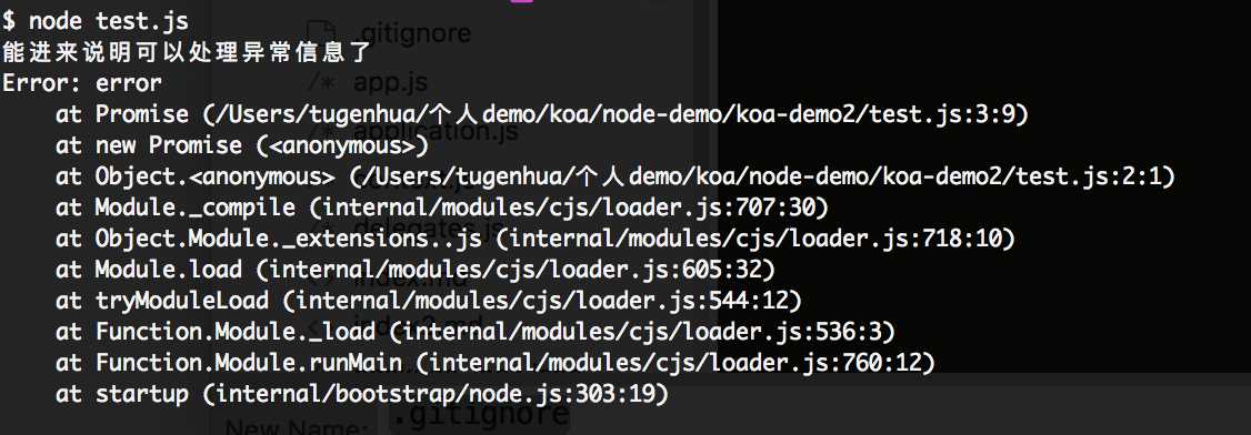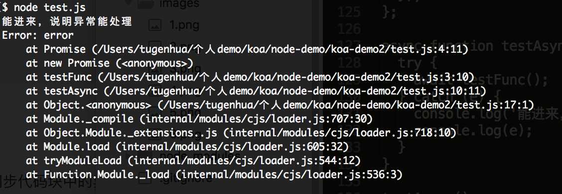 const testFunc = function() { return new Promise((resolve, reject) => { throw new Error(‘error‘); });};async function testAsync() { try { await testFunc(); } catch (e) { console.log(‘能进来,说明异常能处理‘); console.log(e); }}testAsync();