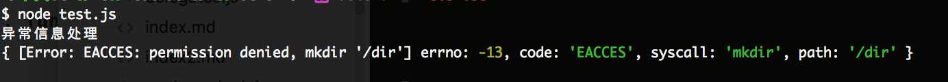 const fs = require(‘fs‘);fs.mkdir(‘/dir‘, (e) => { if (e) { console.log(‘异常信息处理‘); console.log(e); } else { console.log(‘创建目录成功‘); }});
