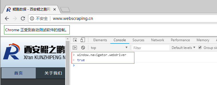 这是不是就意味着selenium真的就无法被网站屏蔽了呢?非也。selenium在运行的时候会暴露出一些预定义的Javascript变量(特征字符串),例如"window.navigator.webdriver",在非selenium环境下其值为undefined,而在selenium环境下,其值为true(如下图所示为selenium驱动下Chrome控制台打印出的值)。