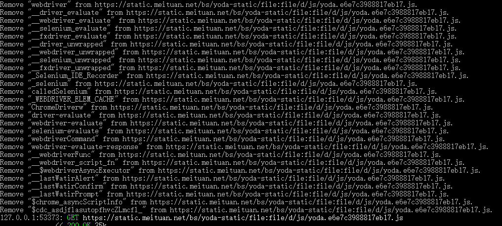 # coding:utf-8# modify_response.pyimport refrom mitmproxy import ctxdef response(flow): """修改应答数据""" if ‘/js/yoda.‘ in flow.request.url: # 屏蔽selenium检测 for webdriver_key in [‘webdriver‘, ‘__driver_evaluate‘, ‘__webdriver_evaluate‘, ‘__selenium_evaluate‘, ‘__fxdriver_evaluate‘, ‘__driver_unwrapped‘, ‘__webdriver_unwrapped‘, ‘__selenium_unwrapped‘, ‘__fxdriver_unwrapped‘, ‘_Selenium_IDE_Recorder‘, ‘_selenium‘, ‘calledSelenium‘, ‘_WEBDRIVER_ELEM_CACHE‘, ‘ChromeDriverw‘, ‘driver-evaluate‘, ‘webdriver-evaluate‘, ‘selenium-evaluate‘, ‘webdriverCommand‘, ‘webdriver-evaluate-response‘, ‘__webdriverFunc‘, ‘__webdriver_script_fn‘, ‘__$webdriverAsyncExecutor‘, ‘__lastWatirAlert‘, ‘__lastWatirConfirm‘, ‘__lastWatirPrompt‘, ‘$chrome_asyncScriptInfo‘, ‘$cdc_asdjflasutopfhvcZLmcfl_‘]: ctx.log.info(‘Remove"{}"from{}.‘.format(webdriver_key,flow.request.url)) flow.response.text=flow.response.text.replace(‘"{}"‘.format(webdriver_key),‘"NO-SUCH-ATTR"‘) flow.response.text=flow.response.text.replace(‘t.webdriver‘,‘false‘) flow.response.text=flow.response.text.replace(‘ChromeDriver‘,‘‘)在selnium中使用该代理(mitmproxy默认监听127.0.0.1:8080)访问目标网站,mitmproxy将过滤JS中的特征符串,如下图所示: