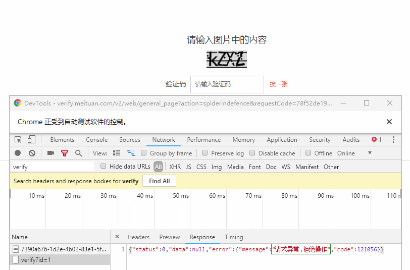 鲲之鹏的技术人员近期就发现了一个能够有效检测并屏蔽selenium的网站应用:大众点评网的验证码表单页,如果是正常的浏览器操作,能够有效的通过验证,但如果是使用selenium就会被识别,即便验证码输入正确,也会被提示“请求异常,拒绝操作”,无法通过验证(如下图所示)。