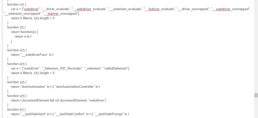了解了这个特点之后,就可以在浏览器客户端JS中通过检测这些特征串来判断当前是否使用了selenium,并将检测结果附加到后续请求之中,这样服务端就能识别并拦截后续的请求。