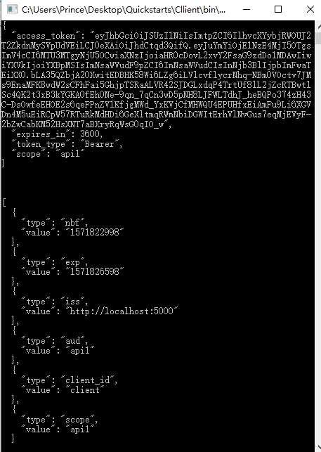 using IdentityModel.Client;using Newtonsoft.Json.Linq;using System;using System.Net.Http;using System.Threading.Tasks;namespace Client{ class Program { static async Task Main(string[] args) { // Console.WriteLine("Hello World!"); var client = new HttpClient(); var disco = await client.GetDiscoveryDocumentAsync("http://localhost:5000"); if (disco.IsError) { Console.WriteLine(disco.Error); return; } var tokenResponse = await client.RequestClientCredentialsTokenAsync(new ClientCredentialsTokenRequest { Address = disco.TokenEndpoint, ClientId = "client", ClientSecret = "aju", Scope = "api1" }); if (tokenResponse.IsError) { Console.WriteLine(tokenResponse.Error); return; } Console.WriteLine(tokenResponse.Json); Console.WriteLine("\n\n"); //call api var apiClient = new HttpClient(); apiClient.SetBearerToken(tokenResponse.AccessToken); var response = await apiClient.GetAsync("http://localhost:5001/identity"); if (!response.IsSuccessStatusCode) { Console.WriteLine(response.StatusCode); } else { var content = await response.Content.ReadAsStringAsync(); Console.WriteLine(JArray.Parse(content)); } Console.ReadLine(); } }}