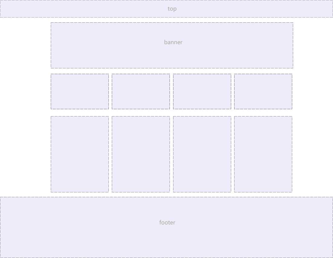 <!DOCTYPE html><html lang="en"><head> <meta charset="UTF-8"> <title>Document</title> <style> .box { /*把各div重复代码抽取出来*/ width: 900px; background-color: #eee; border: 1px dashed #ccc; margin: 0 auto; } .top { height: 80px; } .banner { height: 120px; margin: 5px auto; } .main { height: 500px; } .footer { height: 100px; margin: 5px auto 0; /*上5px,左右居中,下是0px*/ } </style></head><body> <div class="top box">top</div> <div class="banner box">banner</div> <div class="main box"></div> <div class="footer box"></div></body></html>