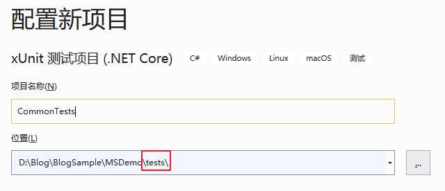 我这里测试项目名称规则为"测试目标项目名称+Tests",这里测试的是Common项目,所以测试项目取名CommonTests