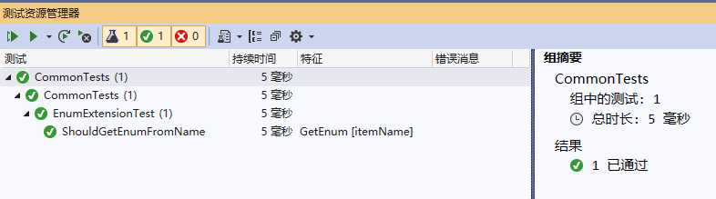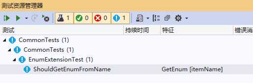 [Fact][Trait("GetEnum", "itemName")]public void ShouldGetEnumFromName(){ Assert.Equal(StatusCode.Deleted, "Deleted".GetEnum<StatusCode>());}[Fact]特性标记,Fact特性还可以给测试用例取别名StatusCode.Deleted值是否和"Deleted".GetEnum<StatusCode>()相同,如果相同表示测试通过在VS中"测试"-"测试资源管理器",打开测试资源管理器: