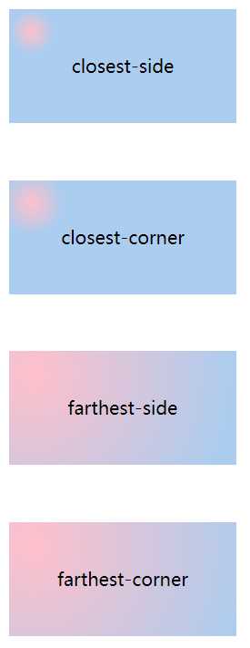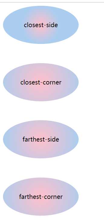 <!DOCTYPE html><html lang="en" manifest="index.manifest"><head><meta charset="UTF-8"><title>Document</title><style> div{ width: 200px; height: 100px; border-radius:50%; margin-bottom:50px; line-height: 100px; text-align: center;/* background:-webkit-radial-gradient(circle, pink, #abcdef); background: -moz-radial-gradient(circle, pink, #abcdef); background: -o-radial-gradient(circle, pink, #abcdef); background: radial-gradient(circle, pink, #abcdef);*/ } div:nth-child(1){ background:-webkit-radial-gradient(closest-side circle, pink, #abcdef); background: -moz-radial-gradient(closest-side circle, pink, #abcdef); background: -o-radial-gradient(closest-side circle, pink, #abcdef); background: radial-gradient(closest-side circle, pink, #abcdef); } div:nth-child(2){ background:-webkit-radial-gradient(closest-corner circle, pink, #abcdef); background: -moz-radial-gradient(closest-corner circle, pink, #abcdef); background: -o-radial-gradient(closest-corner circle, pink, #abcdef); background: radial-gradient(closest-corner circle, pink, #abcdef); } div:nth-child(3){ background:-webkit-radial-gradient(farthest-side circle, pink, #abcdef); background: -moz-radial-gradient(farthest-side circle, pink, #abcdef); background: -o-radial-gradient(farthest-side circle, pink, #abcdef); background: radial-gradient(farthest-side circle, pink, #abcdef); } div:nth-child(4){ background:-webkit-radial-gradient(farthest-corner circle, pink, #abcdef); background: -moz-radial-gradient(farthest-corner circle, pink, #abcdef); background: -o-radial-gradient(farthest-corner circle, pink, #abcdef); background: radial-gradient(farthest-corner circle, pink, #abcdef); }</style></head><body> <div>closest-side</div> <div>closest-corner</div> <div>farthest-side</div> <div>farthest-corner</div></body></html>