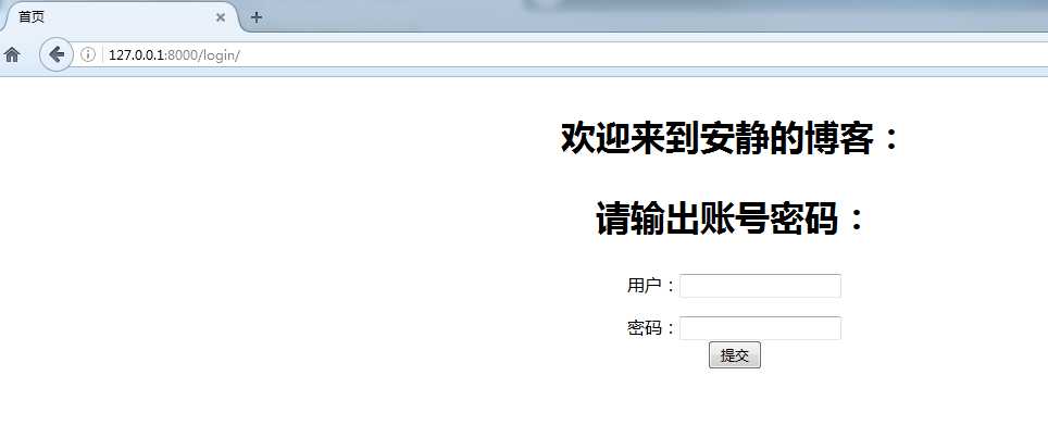 <!DOCTYPE html><html lang="en"><head> <meta charset="UTF-8"> <title>首页</title></head><body> <h1> <p style="text-align:center" font size="2">欢迎来到安静的博客:</p> </h1> <h1> <p style="text-align:center">请输出账号密码:</p> </h1> <form action="/index/" method="post"> <p style="text-align:center">用户:<input type="text" name="username" /><br /> </p> <p style="text-align:center">密码:<input type="password" name="password" /><br /> <input type="submit" value="提交" /> </form></body></html>