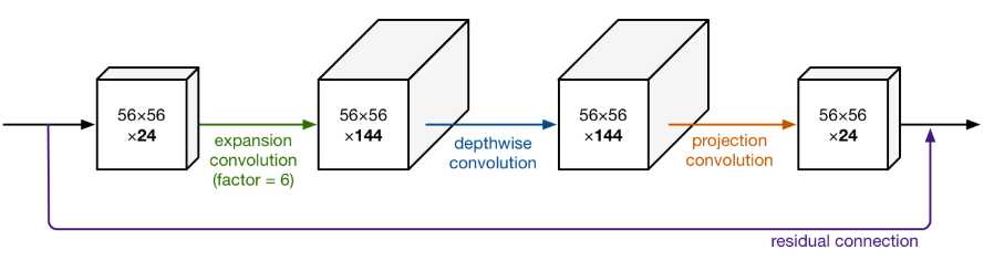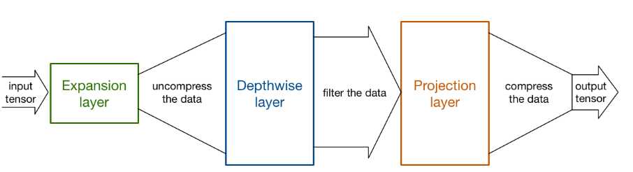 Expansion layer充当解压器(如解压缩),它首先将数据恢复到其完整的形式,然后Depthwise layer执行在网络的这个阶段中任何重要的过滤,最后Projection layer压缩数据使其再次变小。
