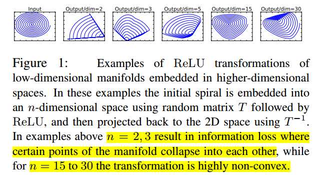 当n = 2,3时(n为通道数量),与Input相比有很大一部分的信息已经丢失了。而当n = 15到30,还是有相当多的地方被保留了下来。也就是说,对低维度做ReLU运算,很容易造成信息的丢失。而在高维度进行ReLU运算的话,信息的丢失则会很少。