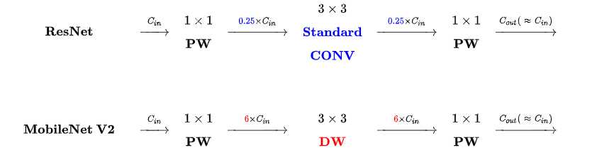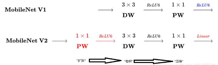 主体结构的block包含了3个卷积层,最后两个卷积层是在MobileNet V1中提到的结构:一个DW (depthwise convolution),一个PW (pointwise convolution) 。然而,此时的1*1的PW操作与MobileNet稍有不同。