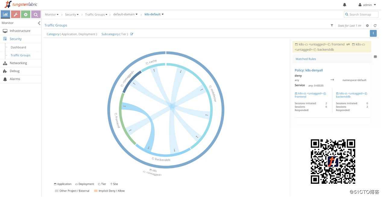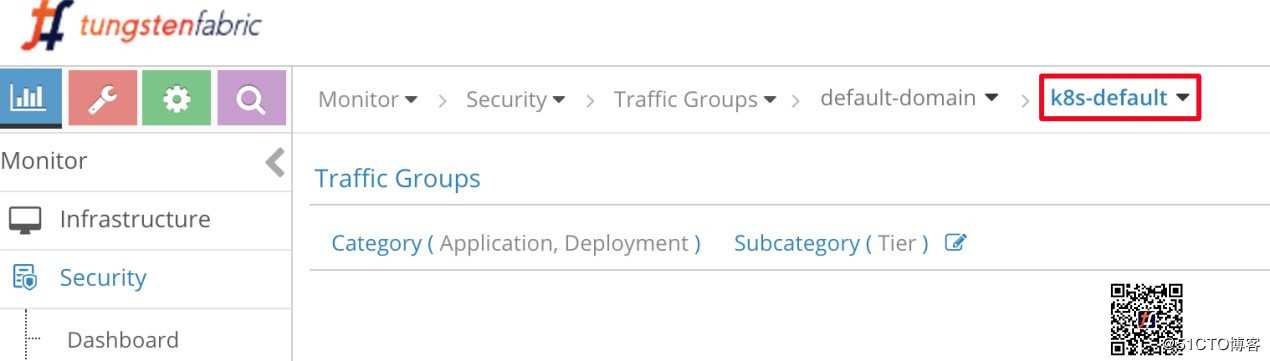 要访问它,请访问Carbide Evaluation Page链接,用于获取访问沙箱控制节点——在顶部有一个名为Contrail UI的链接,完成login和password的输入。单击链接,然后在左上角单击“Monitor”图标,然后在菜单中单击“Security” -> “Traffic Groups”。然后在顶部的标签链,在其末尾选择“k8s-default”: