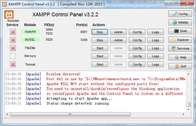 我的电脑启动apacheL的时候 出现异常,因为之前安装过一个类似的application DVWA。也有可能是其他软件占用了固定的端口 ,修改配置文件如下